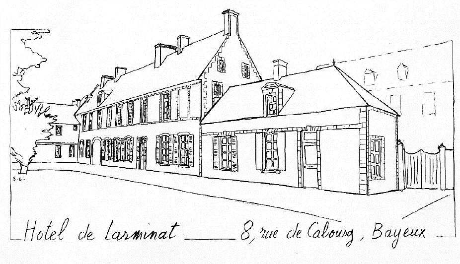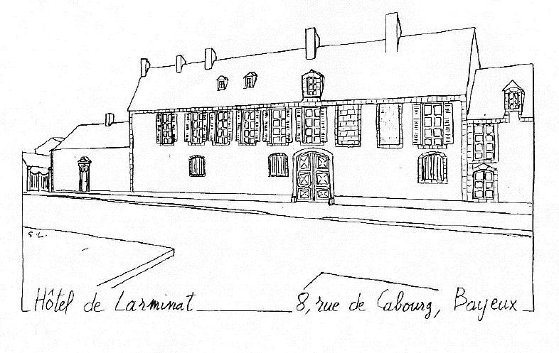 Dès 1880 jusqu'en 1883, son fils Jean, jeune ingénieur s'était installé à Bayeux, rue Cabourg dans le corps de bâtiment du fond de la cour. Il avait même établi pour ses bureaux, un projet d'aménagement des communs qui ne sera pas réalisé. Ils y marient leur dernière fille Adèle de LARMINAT le 28.9.1892 avec Alexis de LAAGE de MEUX. Les noces d'or de Pauline de la Bruchollerie et Pierre-Louis-Edouard de LARMINAT, y sont célébrées en 1894 et Pierre-Louis-Edouard y meurt l'année suivante, le 19.07.1895. Pauline y est morte, six ans plus tard, le 10.03.1901. Personne ne souhaitant la reprendre, la maison de Bayeux fut vendue. Propriété de N. Kervadec en 1997. |