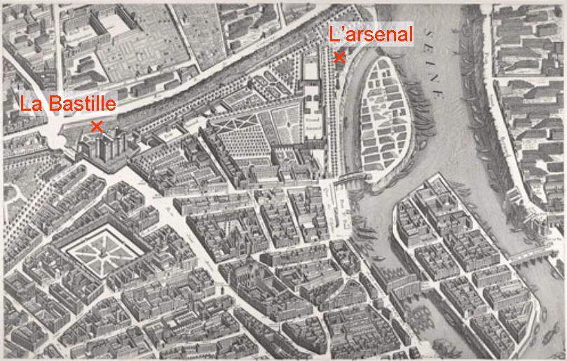 « Pendant ce temps, une foule de peuple forçait l'hôtel de la régie des Poudres et salpêtres, brisait des caisses de munitions et en portait aux combattants... La foule se précipitait dans la place, par la rue de l'Orme St-Gervais, en criant que le gouverneur de la Bastille était pris et qu'on l'amenait à l'Hôtel de Ville. Au même instant, plusieurs personnes sont accourues en disant qu'elles venaient de voir l'homme arrêté, que ce n'était pas le Gouverneur de la Bastille et qu'il n'y avait pas un instant à perdre pour sauver au peuple irrité le malheur d'une méprise.